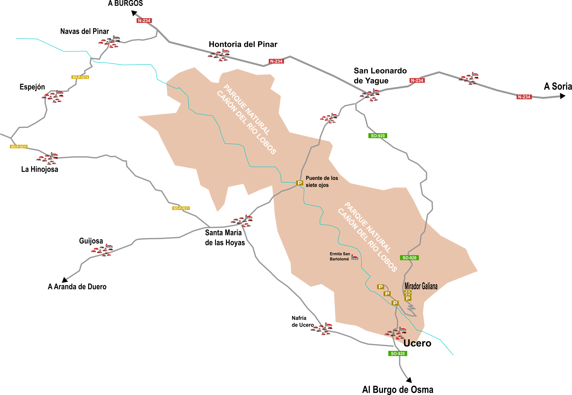 Los accesos principales son tres: Ucero (Soria, entrada sur y más popular), Puente de los Siete Ojos (centro del cañón) y Hontoria del Pinar (Burgos, entrada norte).