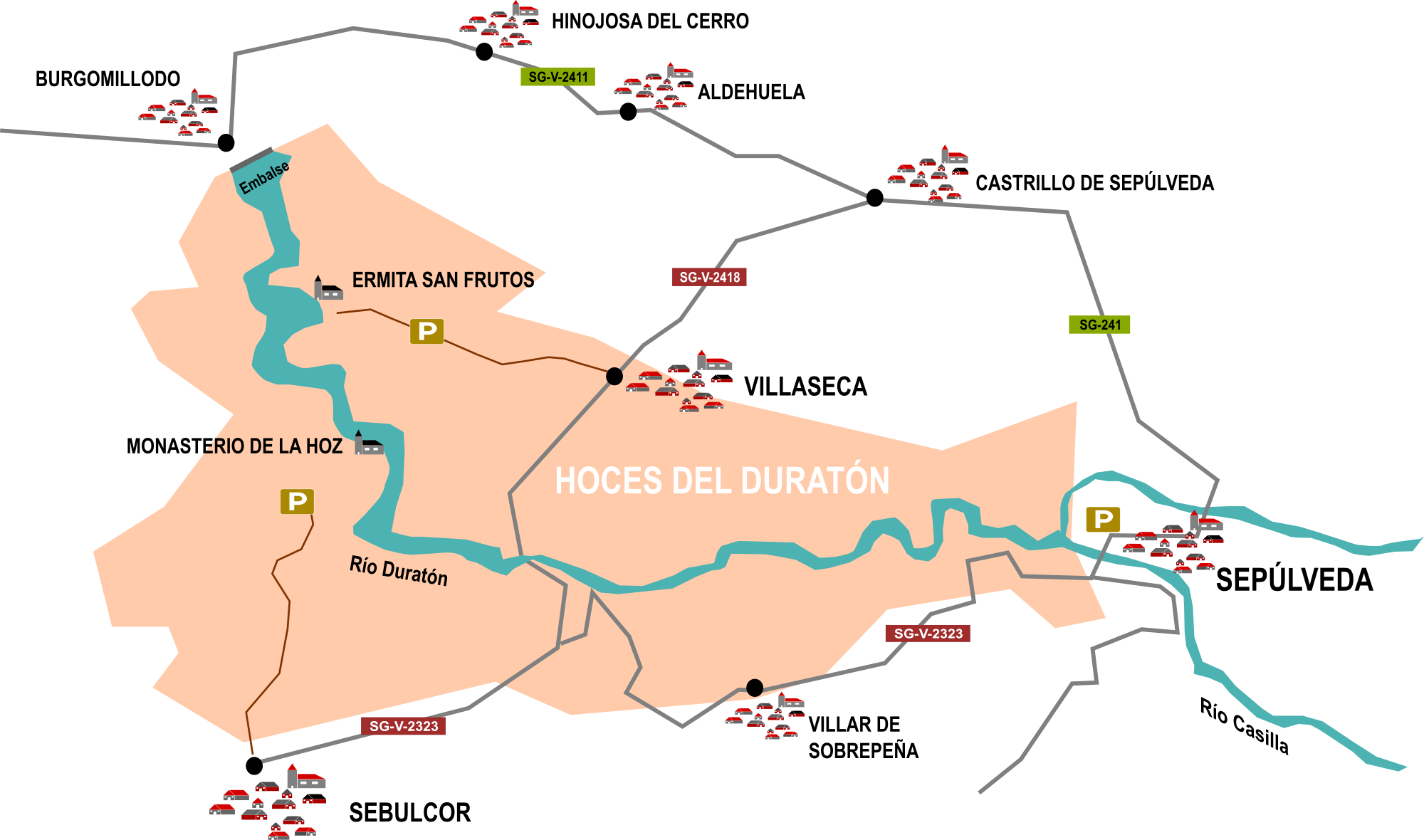 - Aparcamientos: Hay zonas de aparcamiento señalizadas, siendo el más común el que da acceso a la Ermita de San Frutos (se recomienda llegar pronto en temporada alta).