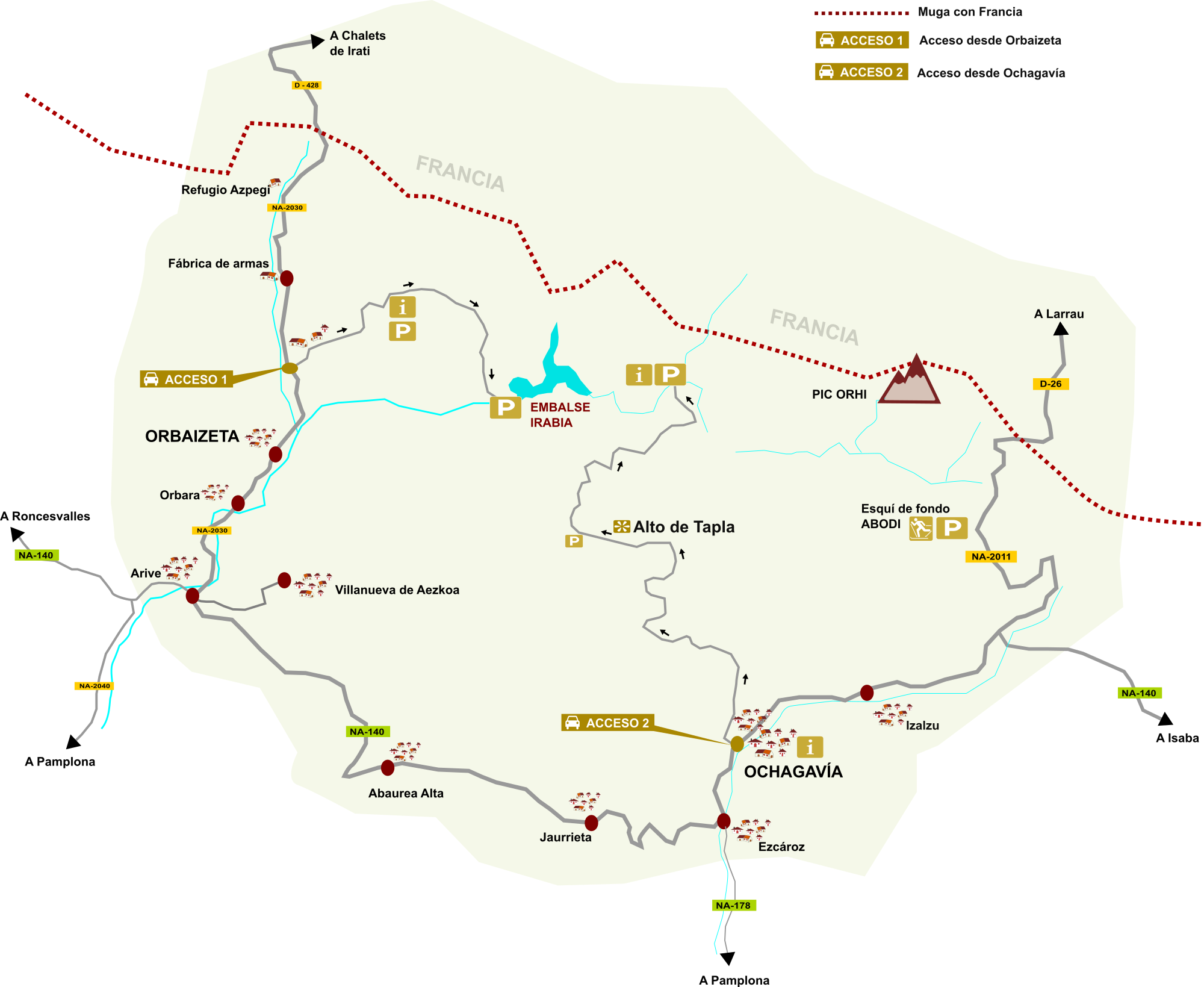 Dos accesos destacados son los que dan entrada a la Selva de Irati: Orbaitzeta en el valle de Aezkoa y Ochagavía en el valle de Salazar. Estas dos localidades se encuentran situadas a poco más de 1 hora en coche desde la capital Navarra. Para llegar a Orbaitzeta desde Pamplona tenemos que coger la autovía del pirineo A21 para llegar a Aoiz o la Na 150. Una vez en Aoiz hay que seguir por la NA 172 y NA 2040 para llegar a Arive.