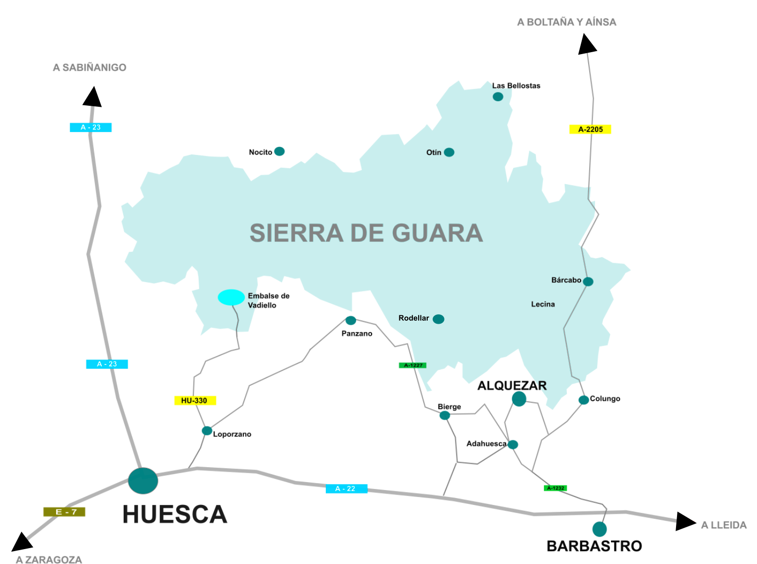 El principal acceso a la Sierra de Guara se realiza desde la ciudad de Huesca, situada a unos 25 kilómetros del parque natural. Desde allí parten varias carreteras que conducen a las diferentes zonas del macizo. Por el oeste, la carretera HU-340 lleva hacia Bierge, Rodellar y Alquézar, tres de los puntos más emblemáticos para los amantes del senderismo, la escalada y el barranquismo. Por el norte, se puede acceder desde Nocito, una pequeña localidad enclavada en plena sierra, ideal para disfrutar de rutas tranquilas y paisajes más salvajes.