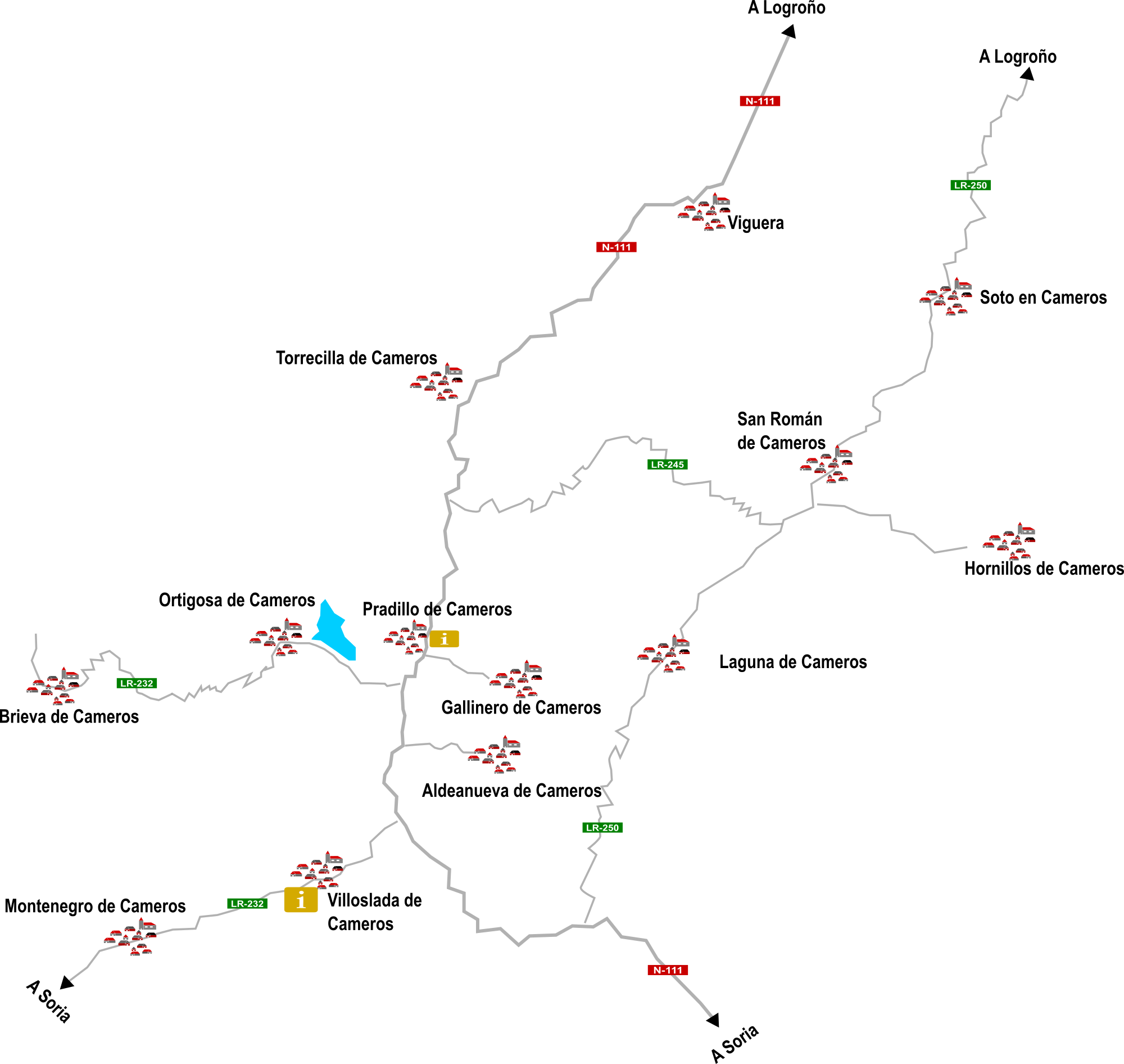 La oferta de alojamiento se centra en el turismo rural, con encanto y ambiente auténtico, principalmente en pueblos como Villoslada de Cameros, El Rasillo de Cameros y otras aldeas.
